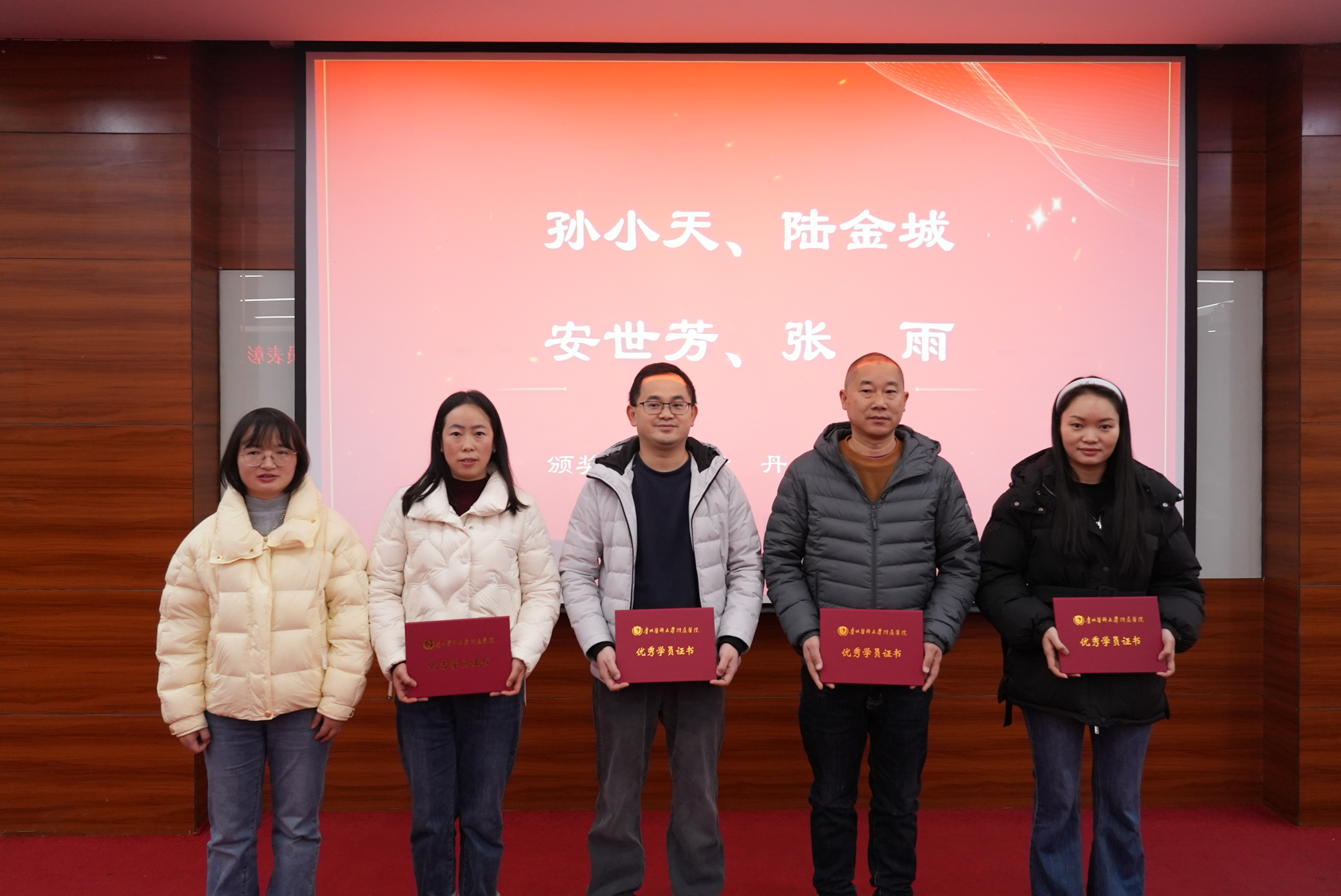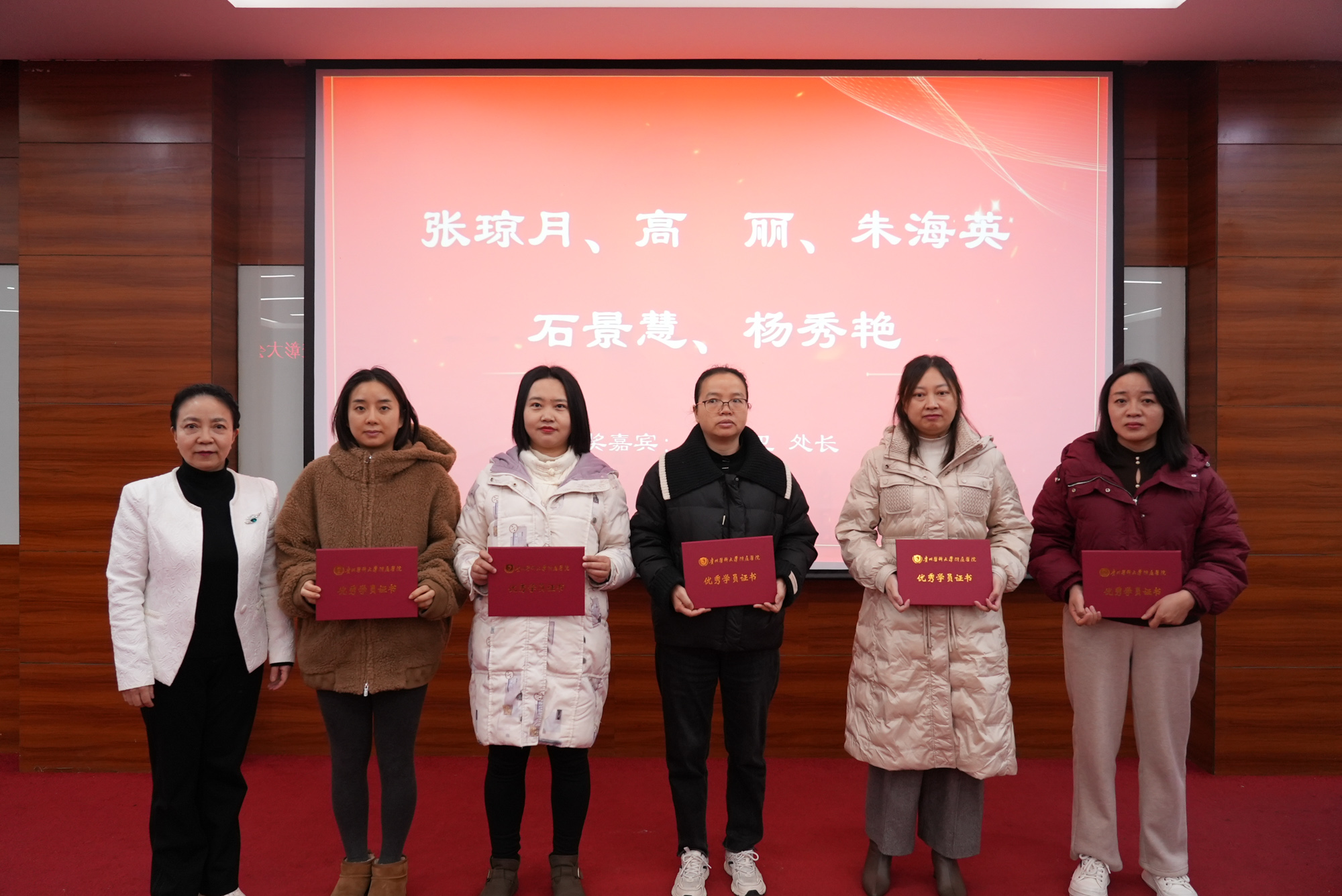 会上,陈海霞宣读了《关于授予贵州省2025年出生缺陷防治人才培训项目张琼月等19名同志为优秀学员的表彰决定》,获得“优秀学员”的人员分别是:张琼月、高丽、朱海英、石景慧、杨秀艳、赵德娟、曾凡其、刘佳敏、袁嫚嫚、田味、莫帮爽、张昌银、田侦丽、王萍、陶兴娅、孙小天、陆金城、安世芳、张雨。受表彰学员分别上台领奖。